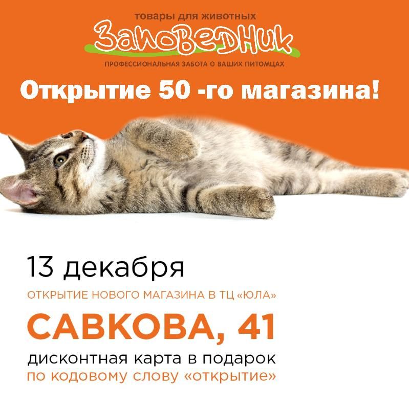 Мы рады сообщить Вам об открытии 50 магазина! Юбилейный розничный магазин "Заповедник" Ждет Вас по алресу Е.Савкова,41 ТЦ "Юла" Рады видеть Вас в новом магазине "Заповедник"